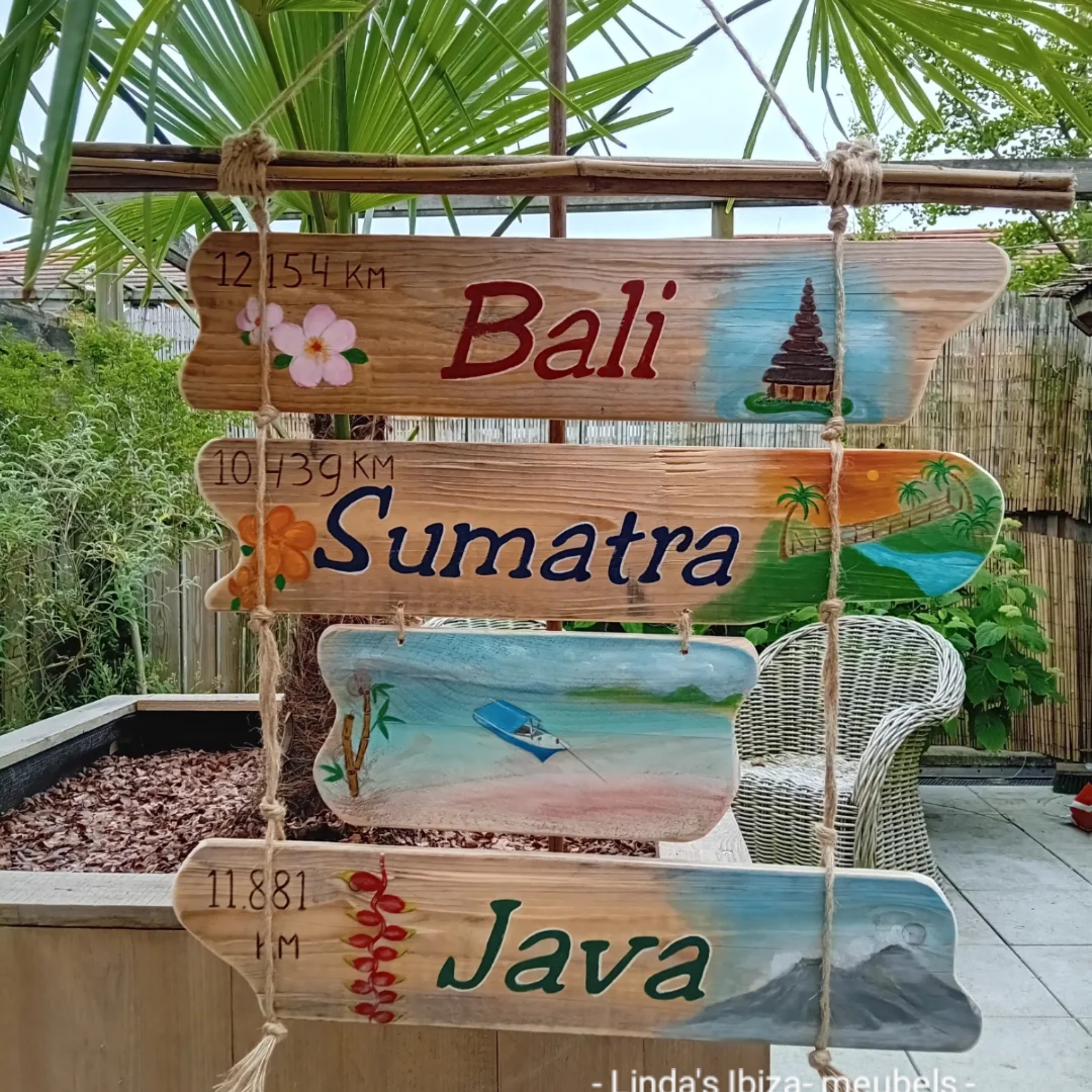 Kleurrijke handgemaakte 'Grote Ibiza wegwijzer (staand op voet), met handgeschilderde letters en afbeeldingen, geheel te maken naar uw wens!