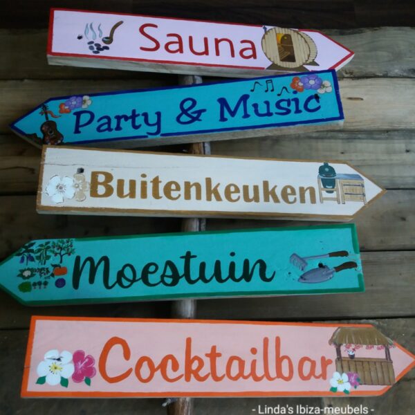 Kleurrijke handgemaakte 'Ibiza style wegwijzer pastel 2' met handgeschilderde letters en afbeeldingen: sauna, party & music, moestuin en cocktailbar. (let op buitenkeuken is uitverkocht) De 4 losse houten borden kunt u zelf monteren naar wens bijvoorbeeld op een paal. Of u kunt de borden ophangen aan een touw zoals op de foto. Afmetingen: planken zijn 55 cm lang per stuk Levertijd: 3-5 werkdagen (de borden zoals op de foto te zien zijn, zijn direct leverbaar) €60 (excl. verzendkosten, ook te verzenden naar België aan te geven bij 'bereken verzendkosten') Verzendkosten: NL €8/BE €19,50 Ook af te halen in Nootdorp. Voor meer informatie of vragen, mail dan naar info@ibiza-meubels.nl