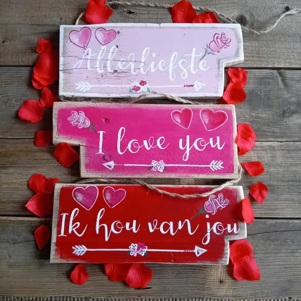 Stoere Valentijnsbordjes geschilderd op oud hout aan touw. Geef bij de bestelnotities aan welk van de 2 borden u wenst (Allerliefste of I love you) Ik hou van jou bord is uitverkocht! Ook direct naar je geliefde te verzenden in een brievenbusdoosje. Afmetingen: 33 x 13 cm Levertijd: 3-5 dagen (direct leverbaar) €22,50 (incl. verzendkosten, brievenbuspakketje) LET OP DIT IS DE PRIJS PER STUK NIET PER 3! Voor meer informatie of vragen mail naar info@ibiza-meubels.nl