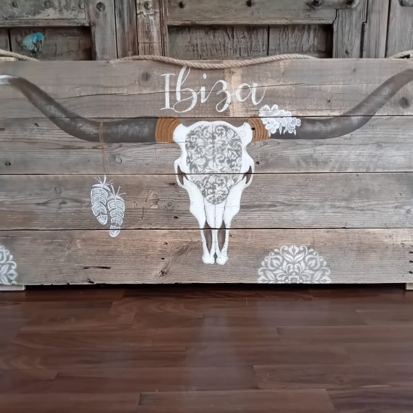 Hangeschilderd Ibiza Skull schilderij voor binnen en voor buiten. Maak je tuin af met een stoer Ibiza schilderij in een groot formaat. Ook in een andere gewenste kleur te laten maken. Afmetingen: 120 x 60 cm. Levertijd: op voorraad (3-5 werkdagen) €99,95 (excl. verzendkosten) Verzendkosten: €15 Of gratis af te halen in Nootdorp Betalen bij afhalen mogelijk Voor meer informatie en vragen mail naar info@ibiza-meubels.nl