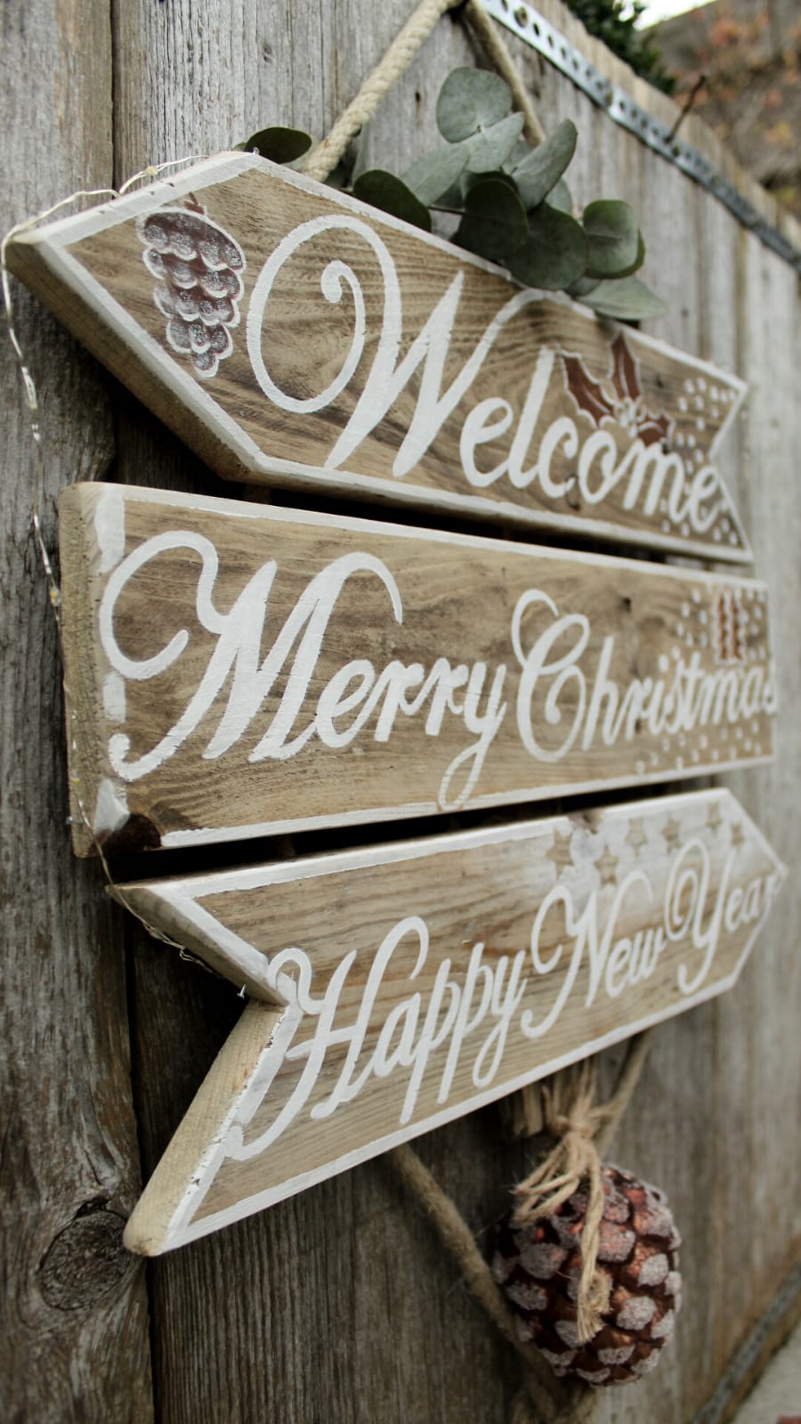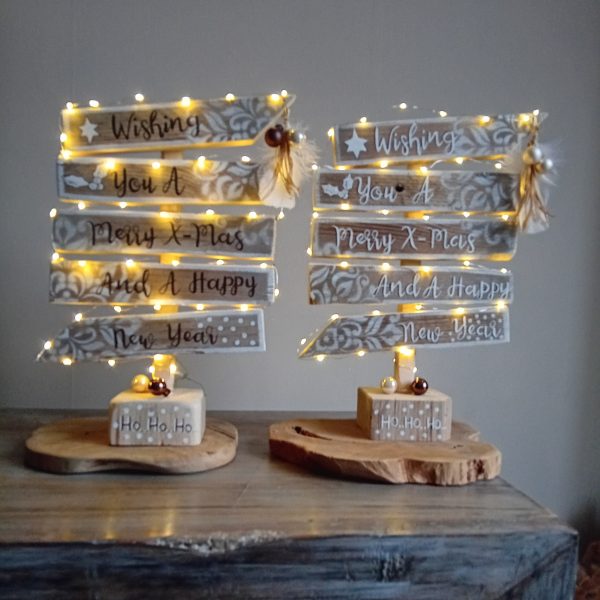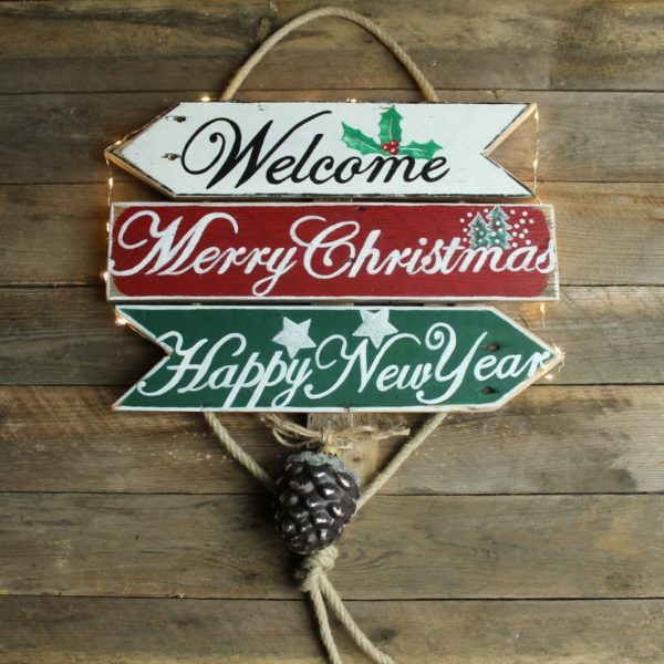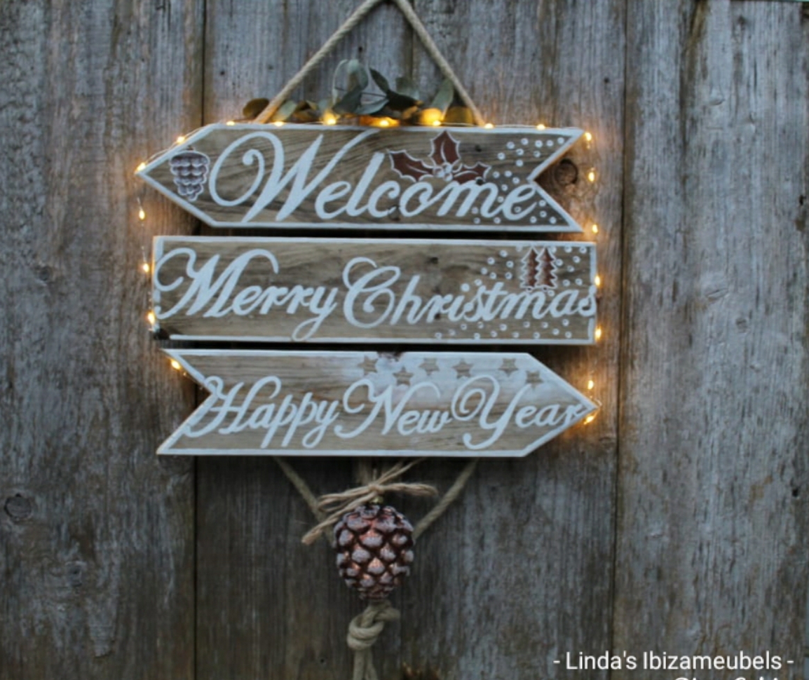 Het kerstbord is gemaakt van oud hout en hangt aan een stevig touw, het bord bevat drie borden en een decoratie hanger onderaan. Inclusief verlichting en batterijen. Kan zowel binnen als buiten worden opgehangen.
