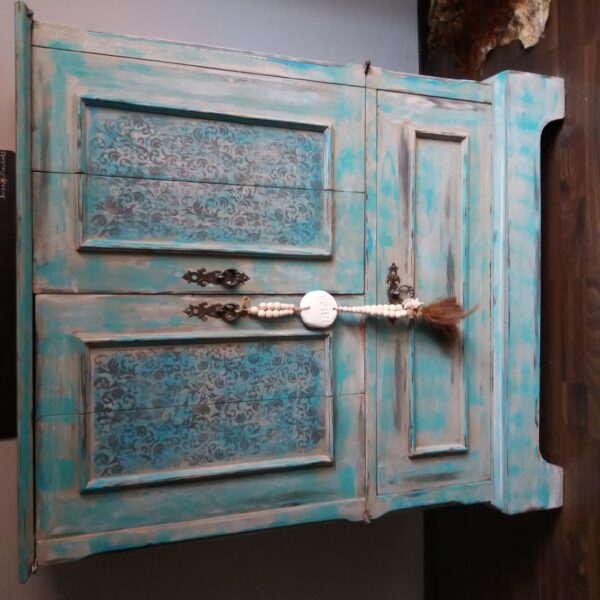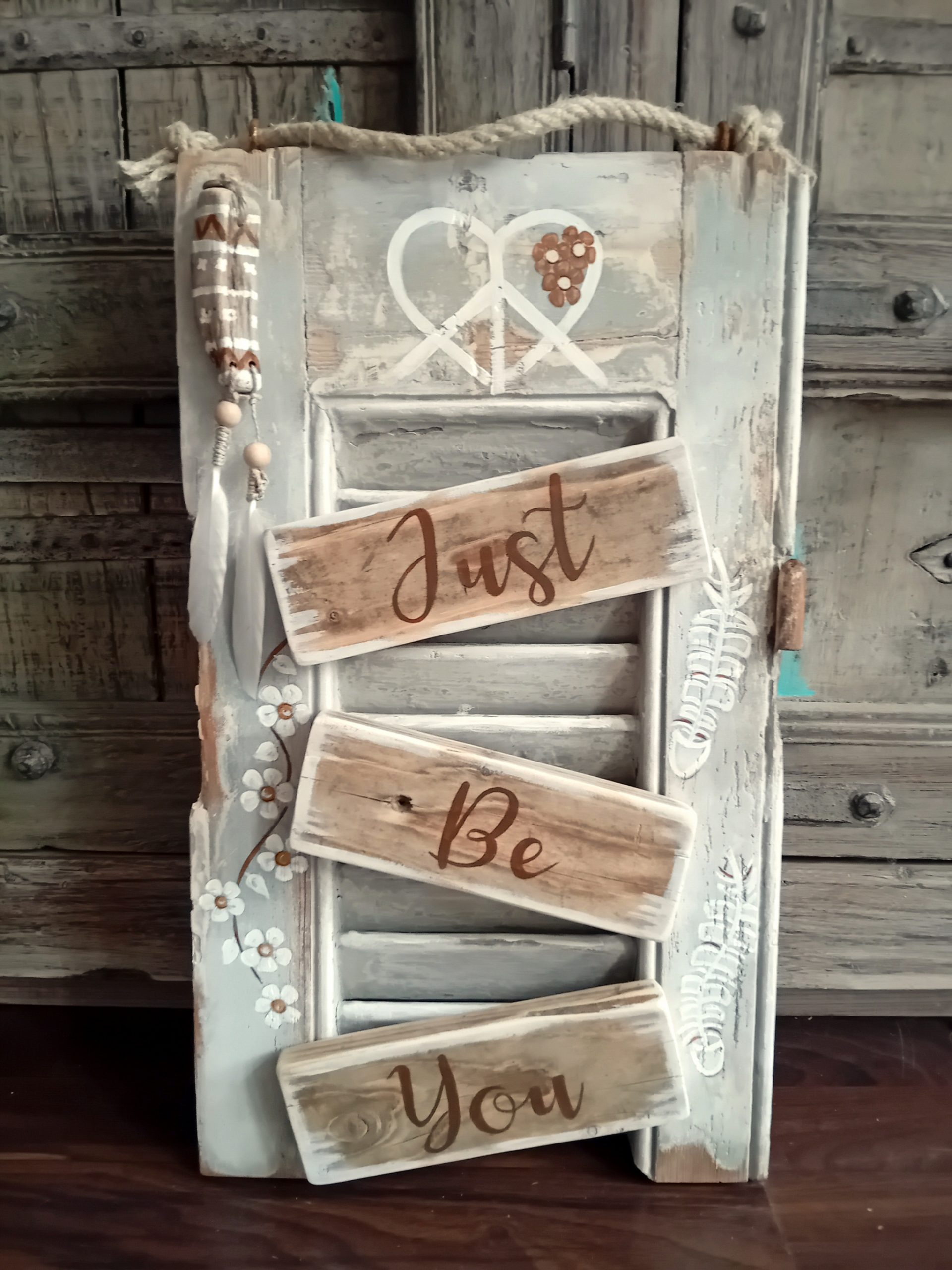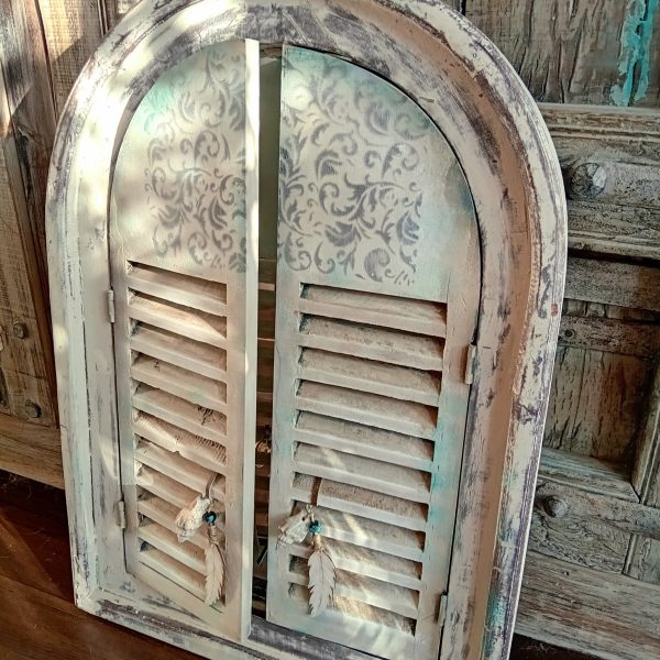 Louvre vintage luikje met authentieke verfresten, wat ik heb gerestyled in een boho Ibizastijl.