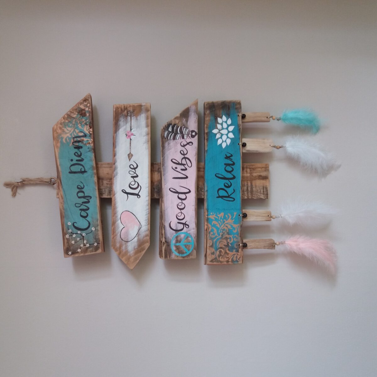 De wegwijzer is gemaakt van oud hout en heeft vier borden met daarop teksten en afbeeldingen (neem contact met ons op indien u andere kleuren/teksten/afbeeldingen wilt hebben of vermeld deze wensen in de notities op de checkout pagina). De wegwijzer hangt aan een stevig touw en heeft een drijfhoutjes met kralen en veren decoratie onderaan (niet geschikt om buiten op te hangen).