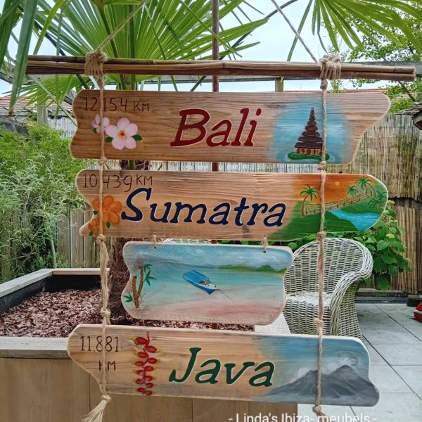 Bali wegwijzer voor de liefhebbers van Indonesië. Met handgeschilderde letters en afbeeldingen, geschikt voor binnen en voor buiten. Afmetingen: 56 x 65 cm (borden zijn 53 cm. breed) Levertijd: 1-5 werkdagen (direct leverbaar) €79 (excl. verzendkosten) Verzendkosten: NL €7,50 Of gratis afhalen in Nootdorp Voor meer informatie of vragen mail naar info@ibiza-meubels.nl